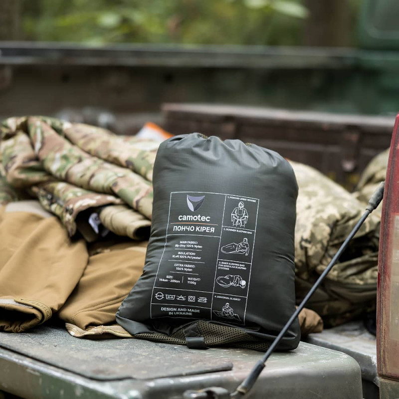 Кірея - довга накидка, яку козаки використовували у походах під час дощу, нею накривали як себе, так і коней чи провізію. Верхній шар виготовлений із зносостійкої нейлонової тканини з мембранної, яка надійно захищає від опадів. У середині легкий, інноваційний утеплювач X-Loft, що забезпечує ефективну терморегуляцію завдяки мікрокамерам, що утримують тепле повітря. Матеріал за своїми властивостями є аналогом натурального пуху. Завдяки вдосконаленій структурі X-Loft не пробивається через тканину, не вбирає вологу та зберігає високу пружність навіть після тривалого використання. Підкладка виготовлена ​​з гладкого, приємного на дотик нейлону. Просторий, зручний капюшон, який можна надіти поверх шолома, з високою горловиною, регульований утяжками з фіксатором. Велика кишеня спереду для дрібниць, а також усередину неї можна скласти пончо, за потреби. Двосторонній бігунок дозволяє розстібати пончо зсередини в режимі спальника. Петлі по кутах для фіксації кілками на землі. Фіксатори-фастекси на еластичній стропі, щоб зручно та швидко зафіксуватися в режимі пончо. Замінює кілька речей, що економить місце в рюкзаку. Зручний компактний мішечок транспортування в комплекті. Варіанти використання: