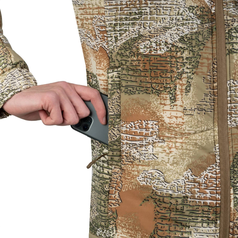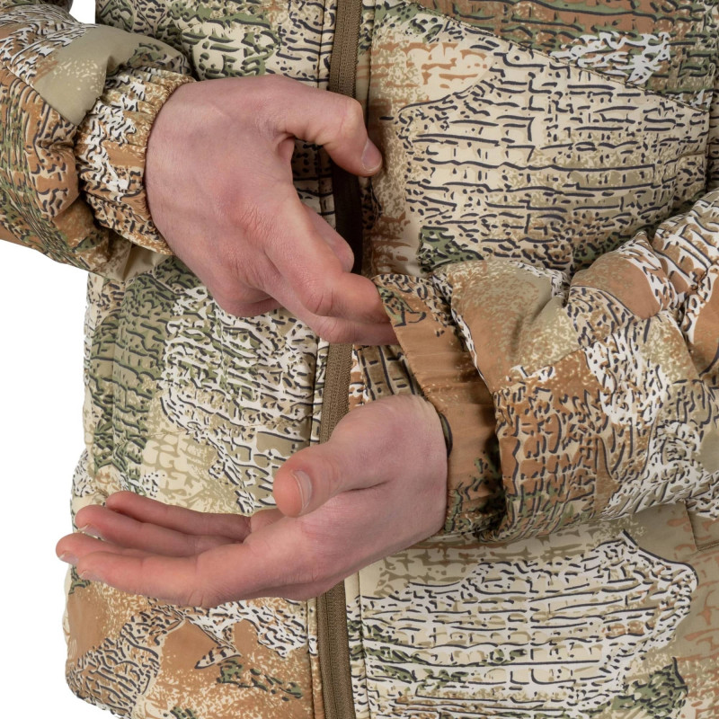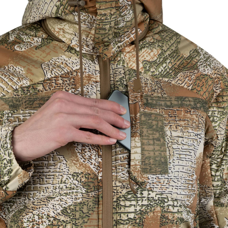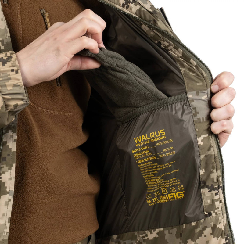 WALRUS MK-2 - це оновлена версія зимової куртки від бренду P1G®. Вона створена, щоб захистити від опадів та зігріти навіть у найхолодніший день. WALRUS підходить як для щоденного використання в місті, так і для тривалих прогулянок на морозному повітрі. Дана модель є комерційним аналогом сьомого шару американської розширеної системи одягу для холодної погоди - ECWCS Gen III Level 7. Нова генерація куртки WALRUS MK-2 отримала оновлену конструкцію та сучасні матеріали завдяки чому стане надійним бар’єром від морозної погоди. Зовнішня частина виготовлена з комбінації двох матеріалів, які на 100% складаються з нейлона. Підкладка також зроблена зі зносостійкого нейлону, що продовжує термін служби виробу. Для плечової зони, зовнішньої частини рукавів і капюшона використана мембранна тканина Ringo. Вона відмінно справляється із захистом від опадів та виведенням зайвих випарів від тіла. Показник водонепроникності 10 000 мм, а паропроникність - 10 000 г/м2 за 24 години. Це просунуті показники, чого більш ніж достатньо для захисту від сильного дощу та снігу. Другий із зовнішніх матеріалів - це Havos Mini Ripstop. Дана тканина в своєму плетені має спеціальну армовану нитку та завдяки цьому забезпечується підвищена зносостійкість. За рахунок комбінації двох зовнішніх матеріалів куртка одночасно захищає від опадів і підтримує терморегуляцію на належному рівні. Також для підтримки стабільної температури тіла та захисту від перегрівання застосоване зональне утеплення. Це зроблено із застосуванням нетканого силікону. В зонах торсу та спини утеплювач має щільність 300 г/м2, бокові зони щільністю 200 г/м2, а капюшон - 100 г/м2. Нетканий силікон - це легкий матеріал, який не збивається в грудки та забезпечує хороше збереження тепла та при цьому не перешкоджає циркуляції повітря. Крій передбачає п’ять містких кишень: дві нижні зовнішні на блискавках, в зоні грудної клітини на блискавці з боковим входом і дві внутрішні з верхнім входом. Центральна блискавка двостороння, тобто має бігунок як зверху, так і знизу. Це дозволяє отримати швидкий доступ до спорядження на поясі. Також на блискавці передбачений інтегрований захист підборіддя - це дрібниця, що додає комфорту. Зсередини куртки, під блискавкою, розміщений спеціальний клапан, який захищає від вітру та опадів. Спереду та на рукавах розміщені панелі-липучки для кріплення знаків ідентифікації (патчів). Плечова зона сконструйована без верхнього шва, що додатково захищає від опадів і підвищує комфорт під час носіння плитоносок чи рюкзаків. Для кращої посадки виробу манжети зроблені еластичними, а нижній край регулюється гумкою зі стоперами. Регулювання нижнього краю відбувається всередині кишень. Окремої уваги заслуговує функціональний капюшон. В разі необхідності його можна зняти або відрегулювати по об’єму спереду та ззаду. Розміри капюшона дозволяють одягати його як поверх шолома, так і зі звичайною шапкою. Знизу капюшона розміщений високий комір-стійка, що закривається на липучках. Завдяки гнучким можливостям його регулювання куртка добре захищає від вітру та холоду, закриваючи половину обличчя. Таким чином добре зберігається тепло під курткою та обличчя захищене від обмороження та обвітрювання.