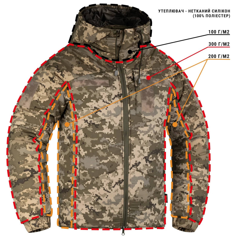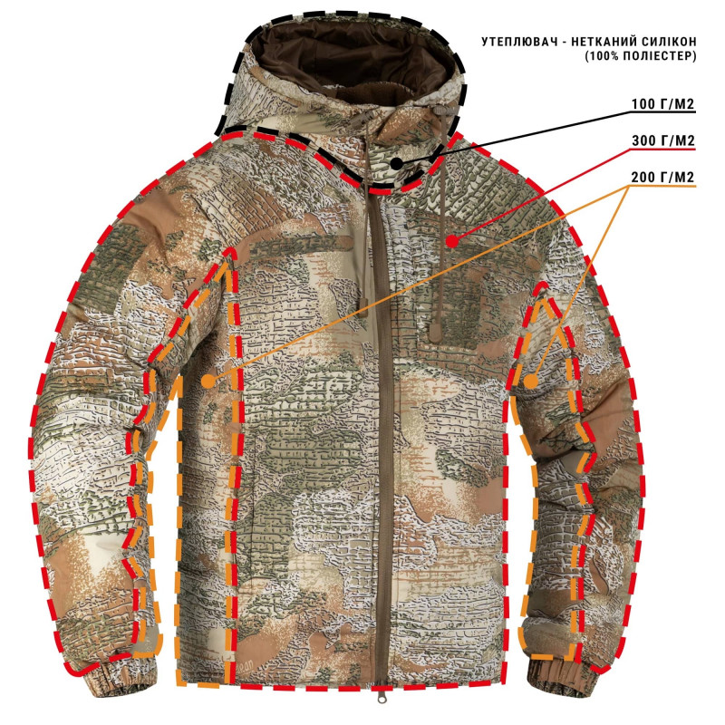 • Утеплювач - Нетканий Силікон (100% Поліестер; торс і спина 300 г/м2, боки 200 г/м2, капюшон  100 г/м2)